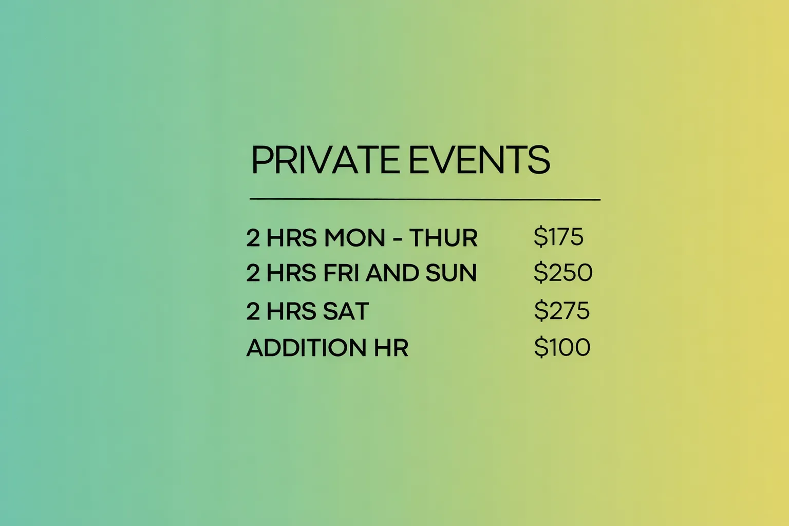 We offer a wide range of date and times available to fit the needs of each person. Our base party is 2 hours long but you are welcome to book for any amount of time. Each hour after the 2 hour base price, is $100 extra per hour.
